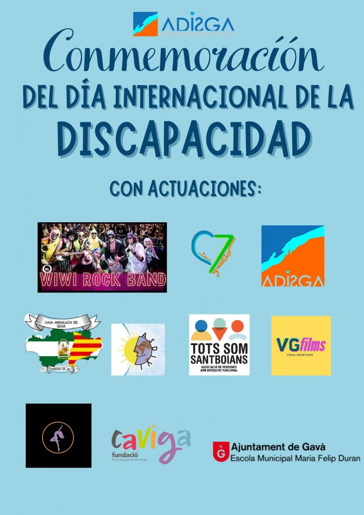 Será el próximo domingo 30 de noviembre de 18:30 a 21:00h, en el teatro Espai Maragall de Gavá. Contaremos con actuaciones en directo de la escuela de baile «El Muro», la «Casa de Andalucía», Escuela de Educación Especial Mª Felip, Asociación Tots Som Santboians, Fundación Ocupacional Caviga, Compañía de teatro «7ymedio», Visual Group Film, y Asociación Asdivi, actuaciones en directo de nuestros peques, de Arnau y Martina, miembros de Adisga. Todos ellos, artistas con capacidades diversas y maravillosas.